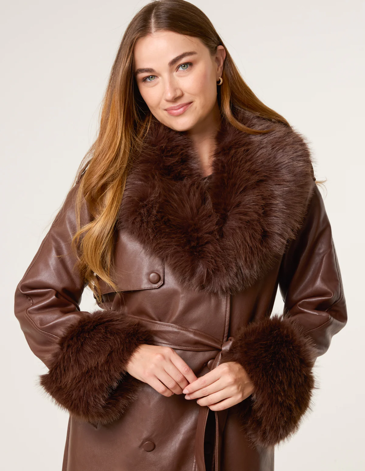 A stunning trimmed faux fur coat with a waist belt for a personalised fit. This coat will provide all the glam you need all season long.