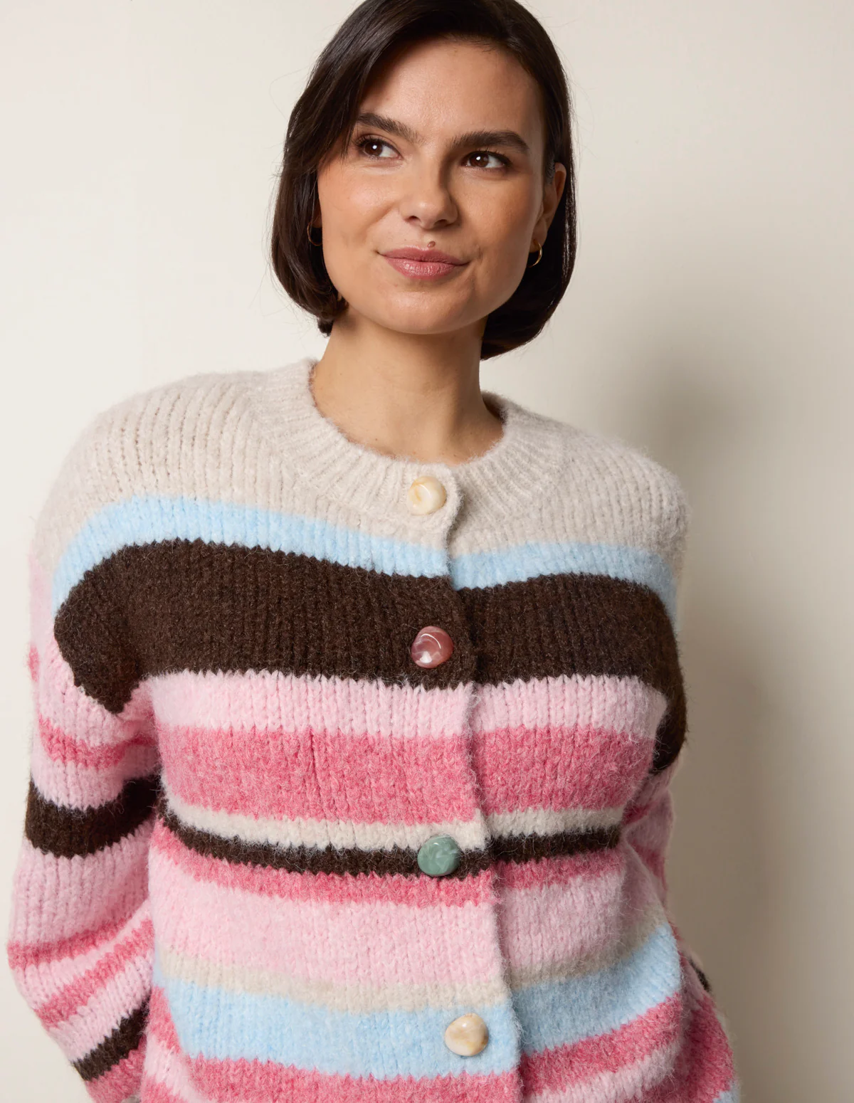 Add a cosy touch to your look with this striped cardigan. Its colourful buttons bring a stylish touch to the button-up knit.